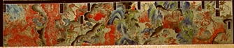 (3)众合地狱:描绘罪人倒挂树上,被妇人片片割削,被猛火烧灼,被狱卒用岩石夹碎肢体的情景。经论中云:在黑绳下,纵广同前,多有铁山两两相对,牛头马头等诸狱卒手执器杖,驱令入于山间,是时两山迫来合押,身体摧碎,血流满地;或有铁山从空而落,打于罪人,碎如沙揣;或置石上,以岩押之;或入铁臼,以铁杵捣,极恶狱鬼并热铁师子、虎、狼等诸兽、乌鹫等鸟竞来食啖(依《瑜伽师地论》、《大智度论》)[64]。又铁炎嘴鹫取其肠已,挂在树头而啖食之。彼有大河,中有铁钩皆悉火燃,狱卒执罪人掷彼河中堕铁钩上;又彼河中有热赤铜汁漂彼罪人,或有身如日初出者,有身沉没如重石者,有举手向天而号哭者,有共相近而号哭者,久受大苦,无主无救。又复狱卒取地狱人置刀叶林,见彼树头有相好端正严饰妇女,如是见已即上彼树,树叶如刀割其身肉,次割其筋,如是劈割一切处;已得上树,已见彼妇女复在于地,以欲媚眼上看罪人,作如是言:念汝因缘,我到此处,汝今何故不来近我?何不抱我?罪人见已欲心炽盛,次第复下,刀叶向上,利如剃刀,如前遍割一切身分;既到地已而彼妇女复在树头,罪人见已而复上树。如是无量百千亿岁,自心所诳,彼地狱中如是转行、如是被烧,邪欲为因。(乃至广说