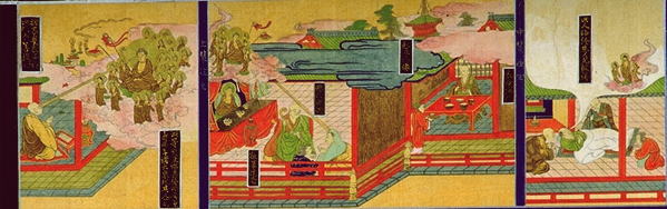 (2)中辈往生:描绘在家净土行者临终之时化佛来迎的情景。经云:十方世界诸天人民,其有至心愿生彼国,虽不能行作沙门、大修功德,当发无上菩提之心,一向专念无量寿佛,多少修善,奉持斋戒,起立塔像,饭食沙门,悬缯然灯,散华烧香,以此回向愿生彼国。其人临终,无量寿佛化现其身,光明相好具如真佛,与诸大众现其人前,即随化佛往生其国,住不退转,功德智慧次如上辈者也[51]。见《无量寿经》第23段。